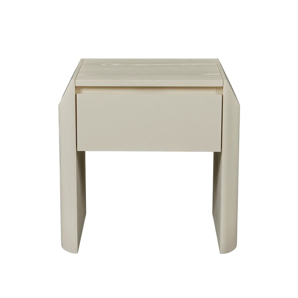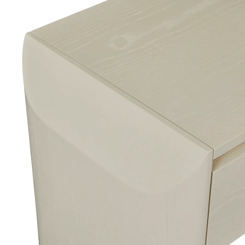 Contemporary charm radiates through the Luna Bedside's blend of geometric forms, featuring half ellipse legs paired with chamfered top detailing. Soft curves meet sharp angles across this sophisticated storage piece, finished beautifully in ash veneer. Minimalist shadow line handles complement modern spaces while maintaining visual simplicity. Each drawer provides practical storage wrapped within refined joinery elements, creating statement yet understated bedside practicality