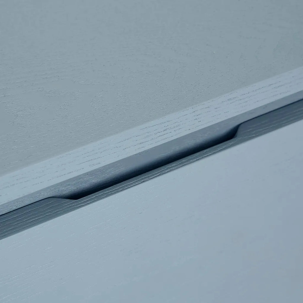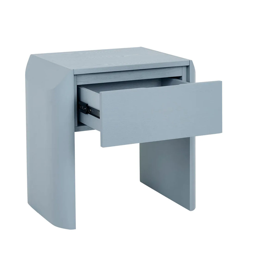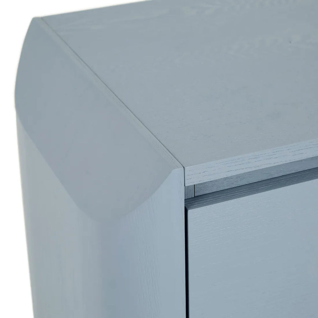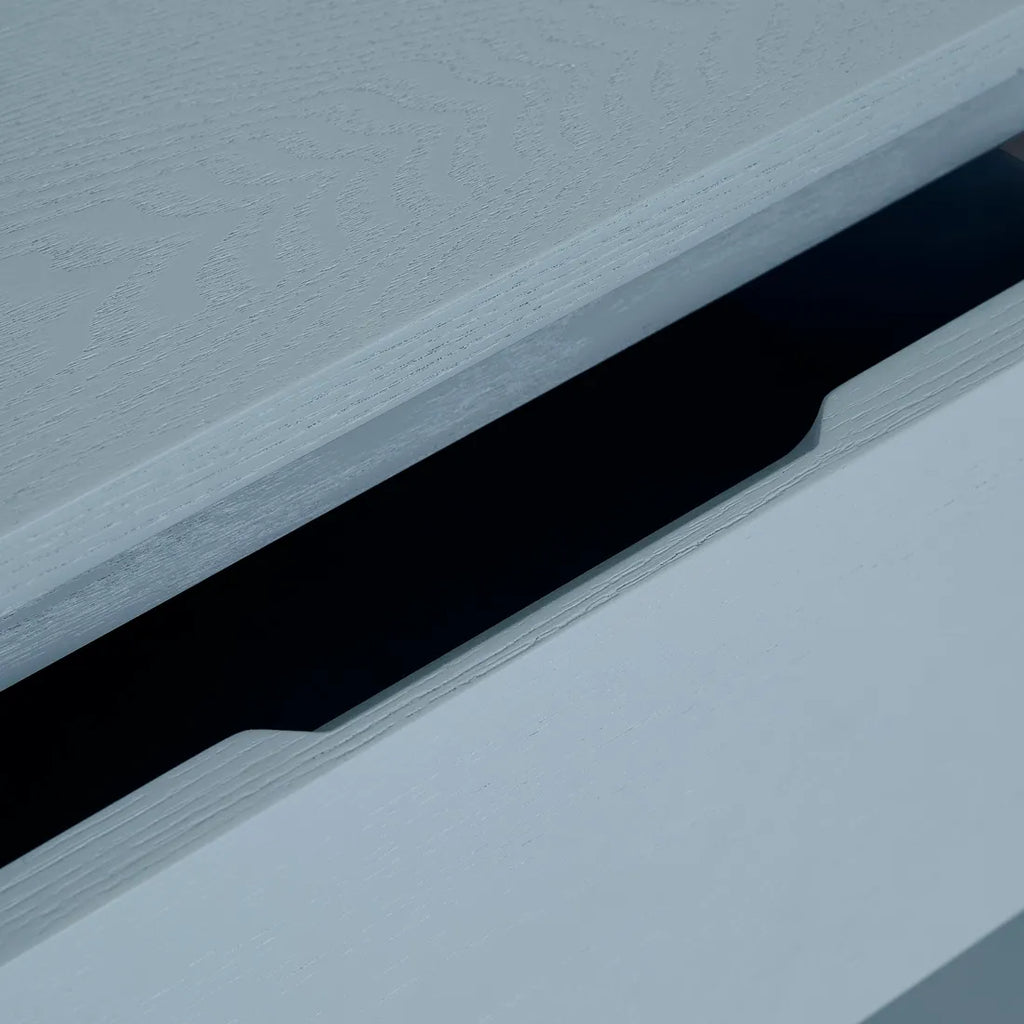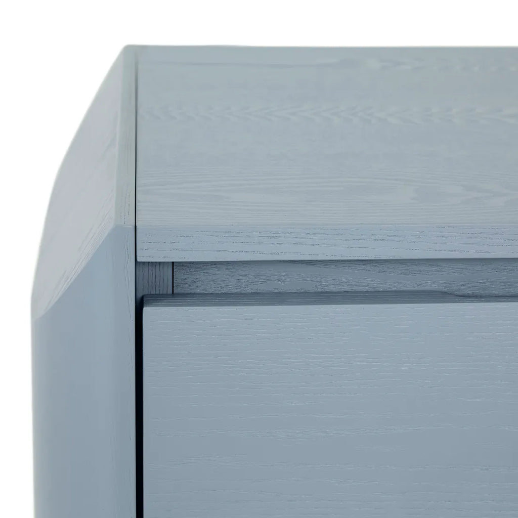 Contemporary charm radiates through the Luna Bedside's blend of geometric forms, featuring half ellipse legs paired with chamfered top detailing. Soft curves meet sharp angles across this sophisticated storage piece, finished beautifully in ash veneer. Minimalist shadow line handles complement modern spaces while maintaining visual simplicity. Each drawer provides practical storage wrapped within refined joinery elements, creating statement yet understated bedside practicality