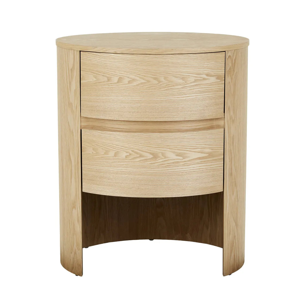 Sleek curves distinguish the Oberon Lune Bedside, where painted ash veneer creates minimalist sophistication. Dual curved drawers feature finger pull handles, presenting seamless storage solutions within oval-shaped form. Contemporary proportions deliver generous surface and storage, making this bedside perfect for taller bedroom ensembles. Ash veneer complements modern interiors while celebrating refined craftsmanship through every considered detail.