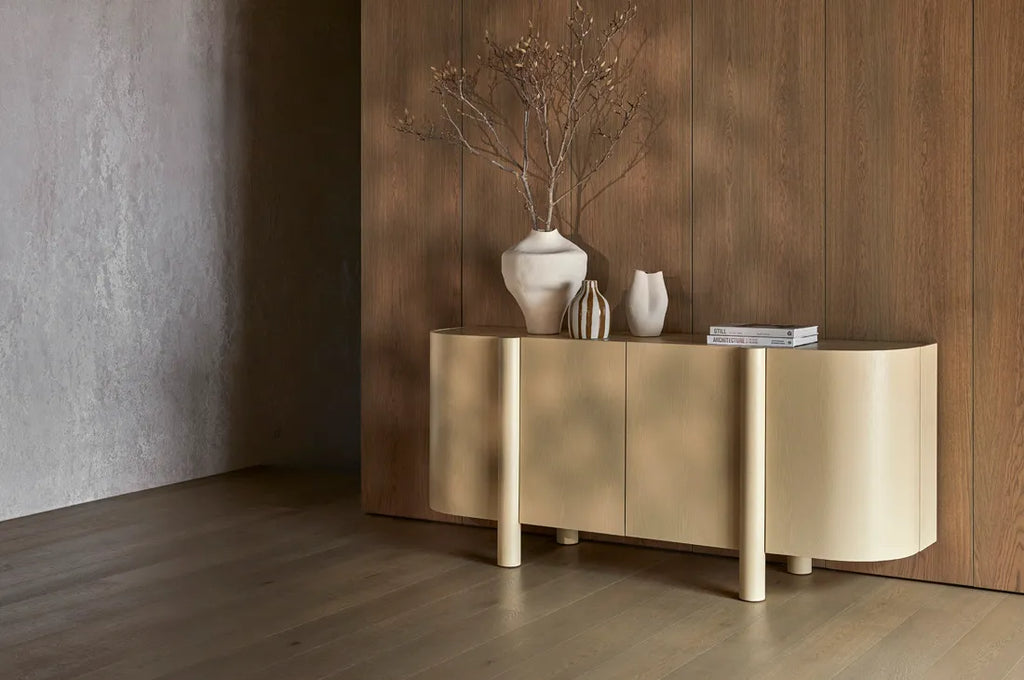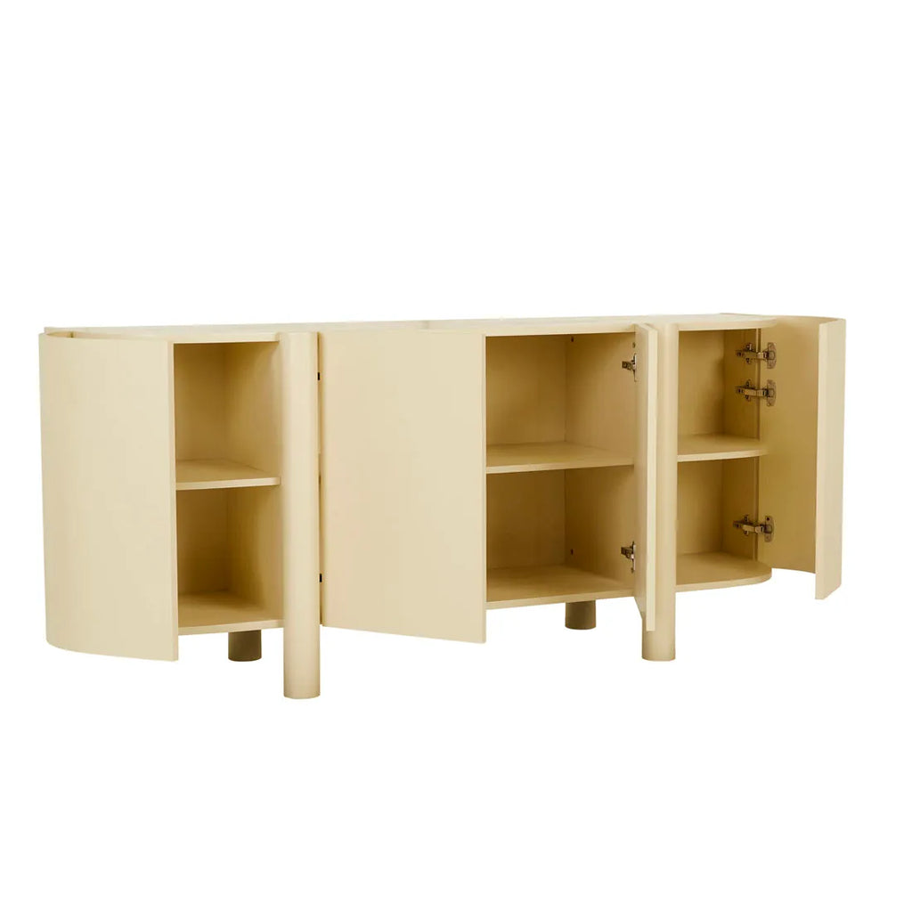 Crafted from solid ash and ash veneers, this artie buffet features a durable PU sealer. It boasts four doors with soft close Hettich hardware, providing access to three spacious compartments and one shelf per compartment.