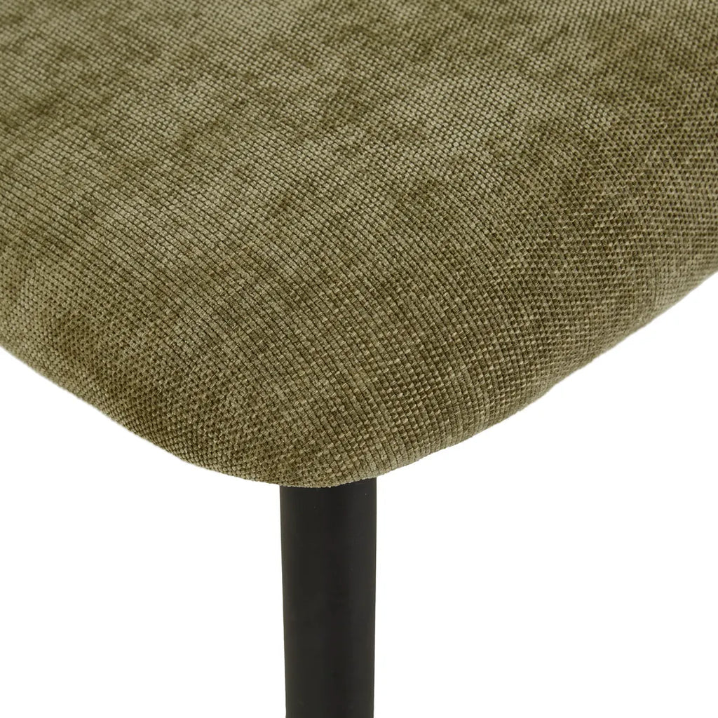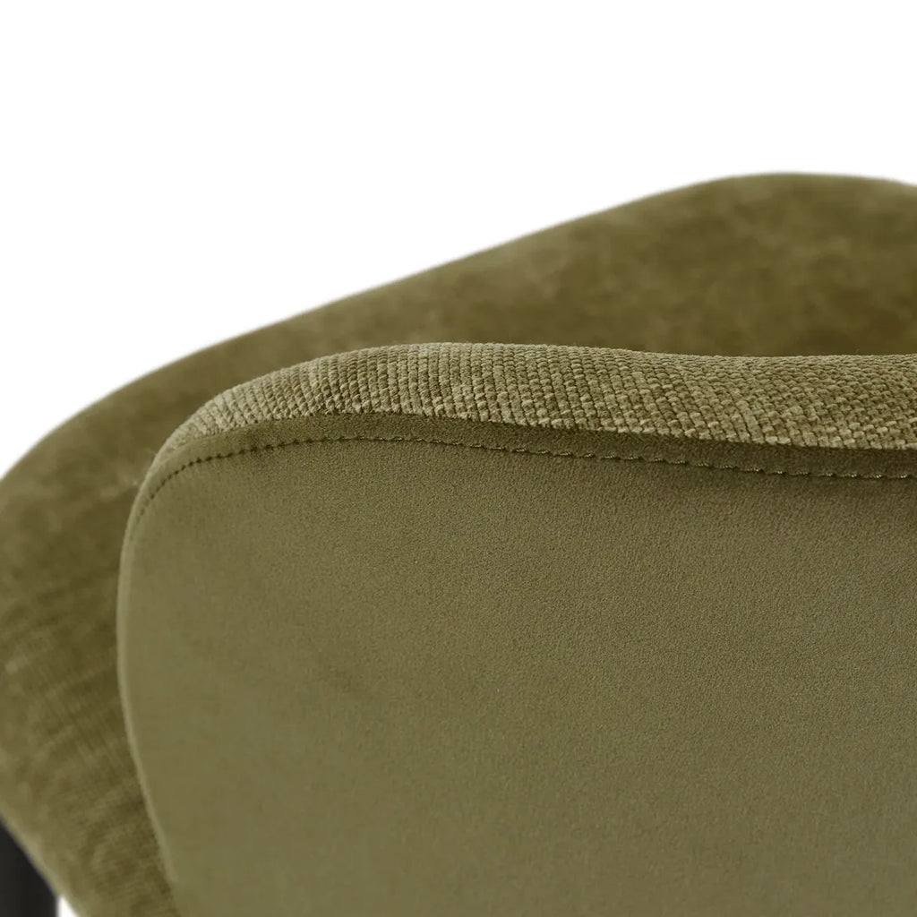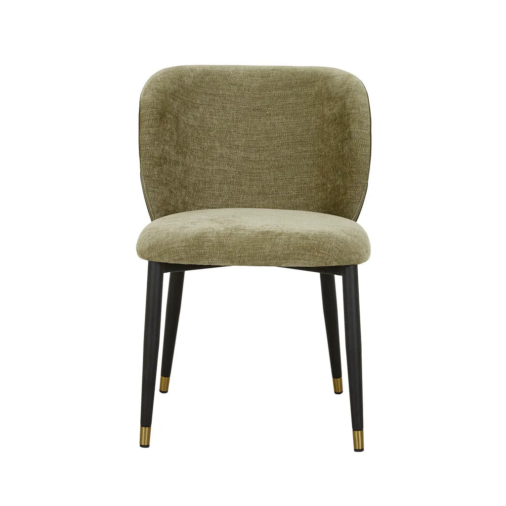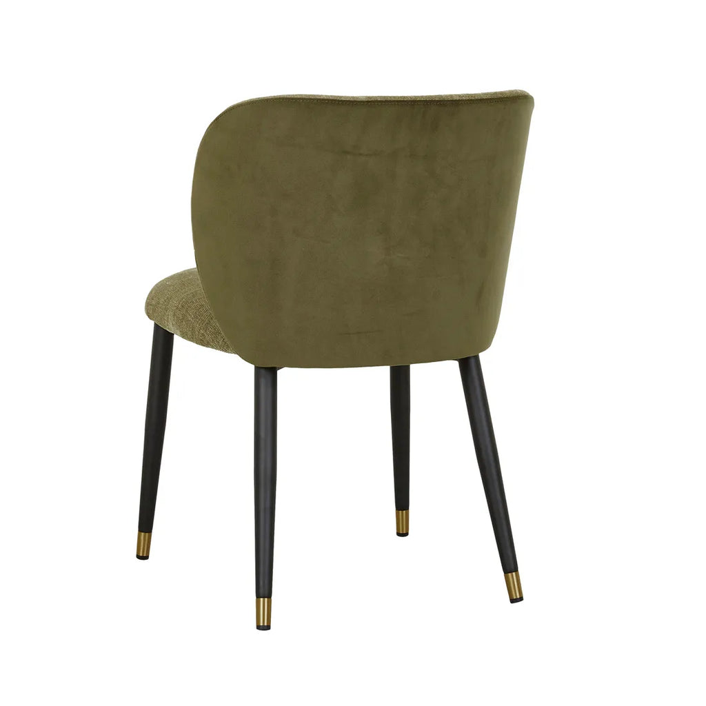 The Cara Dining Chair upholstered and brass tip details creates a bold visual contrast, making a striking statement in any dining area. Its gently curved back ensures optimal support and comfort, while the sophisticated design adds a dramatic touch to modern dining spaces.