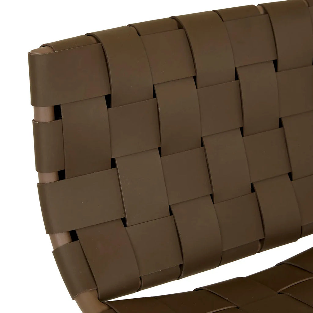 Made from upcycled leather and showcasing a woven seat and backrest, this barstool exudes luxury. Complemented by a powder-coated iron leg, it is the epitome of sophistication.