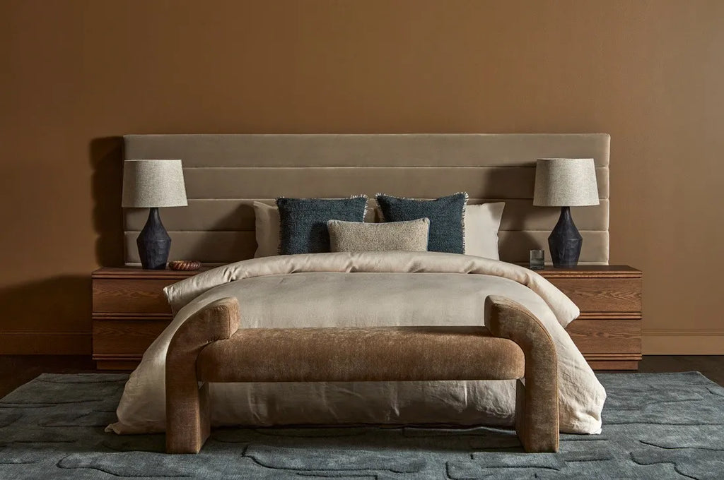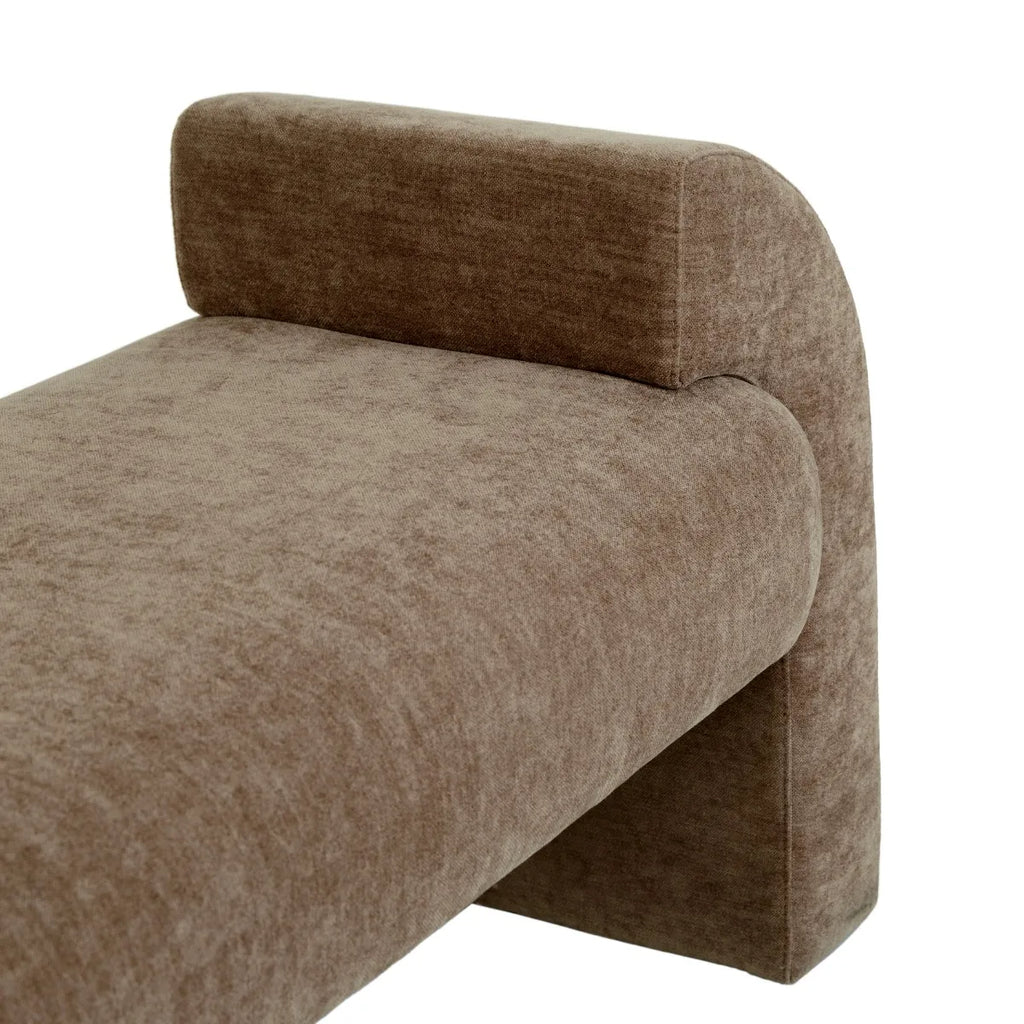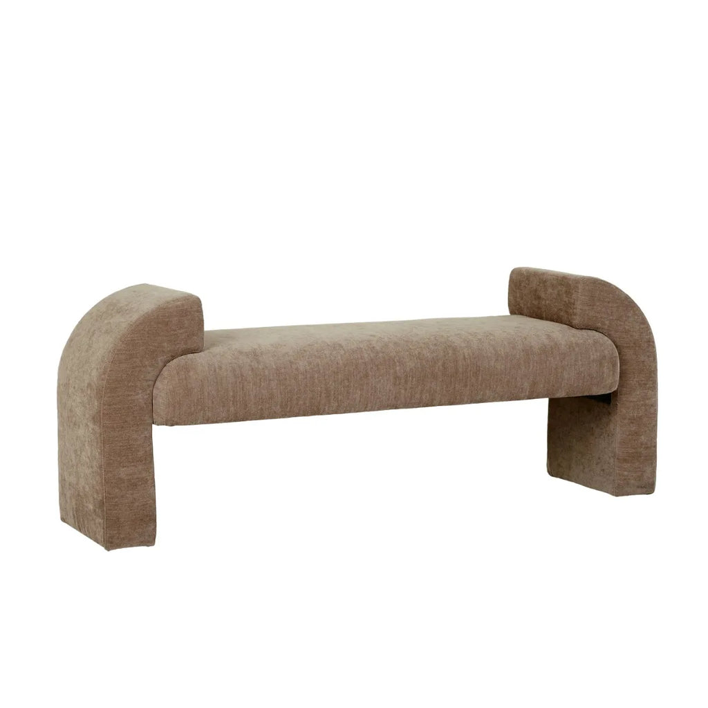 Fluid sophistication defines the Juno Aubury Bench Seat through graceful curves creating waterfall edges. The upholstery wraps luxuriously across each surface, providing indulgent comfort while maintaining modern minimalist appeal. Precise proportions make this piece perfectly suited for use at the end of queen beds, delivering practical luxury for contemporary bedrooms. Natural tones radiate warmth, establishing refined presence within upscale interior spaces.