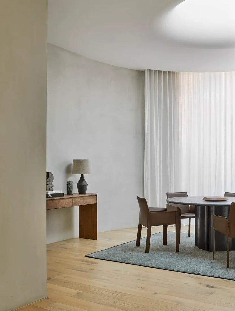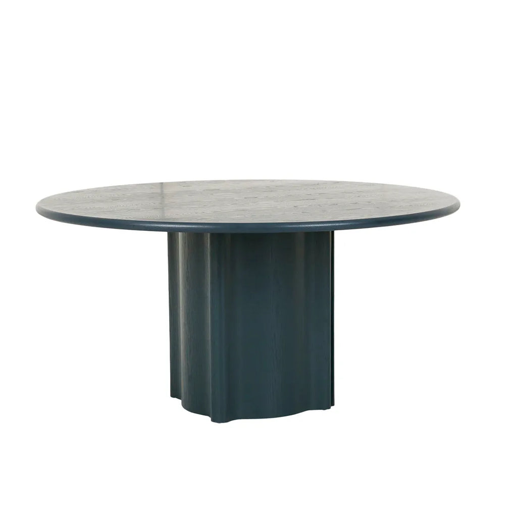 The Leon Round Dining Table features a classic design inspired by the undulating columns of Roman architecture. It boasts a beautifully sculpted pillar base and a round top with a full bullnose profile. Finished with painted ash veneer, this elegant dining table adds timeless sophistication to any indoor dining space
