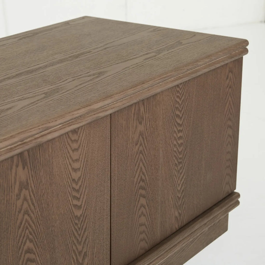 Architectural elegance meets refined storagethrough the Anais Entertainment Unit, inspired by traditional mouldings reimagined for modern spaces. Double bullnose detailing adorns the top and bottom of the case, while flush-finished sides enable seamless placement options when creating larger configurations. Smoked ash veneer brings classic sophistication, while push-to-open doors and internal shelving maximises functional storage within this timeless piece.