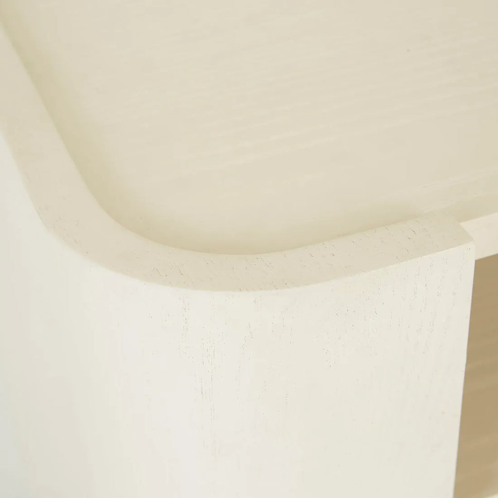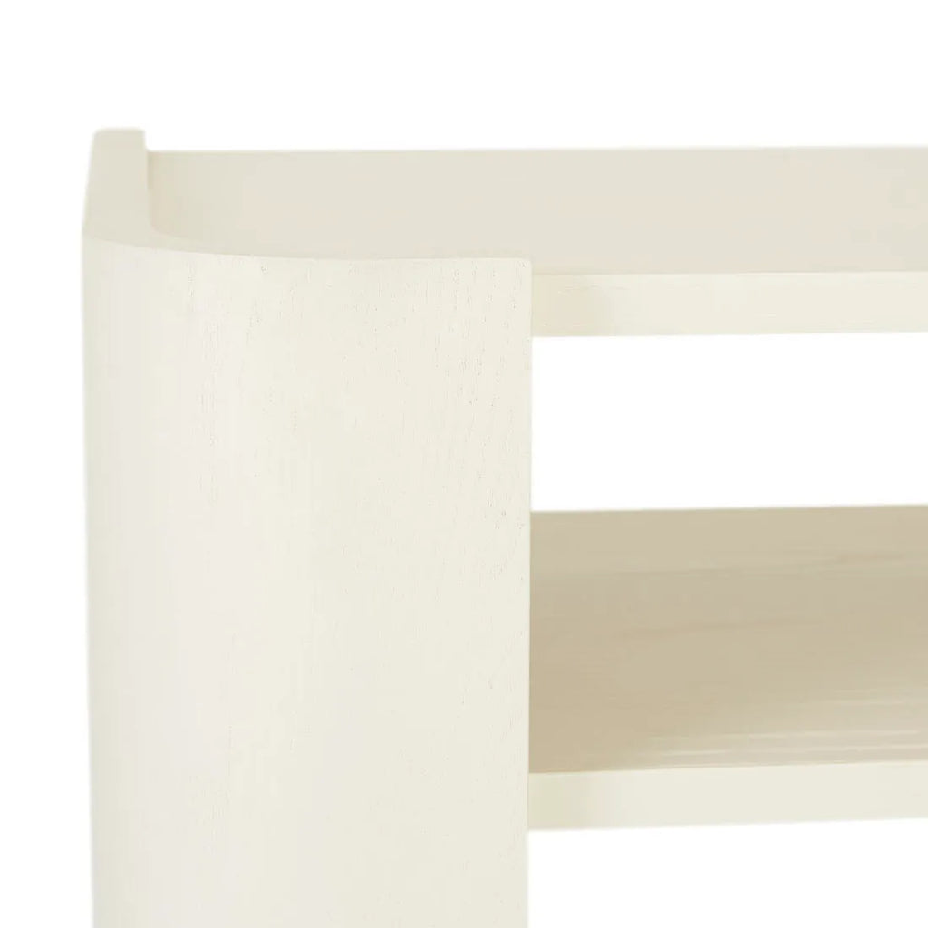 Graceful curves define the Elsie Console, showcasing ash veneer craftsmanship through minimalist design elements. Sculptural lines flow seamlessly across open shelving, creating practical storage wrapped within modern aesthetics. Natural ash radiates calm sophistication while maintaining visual lightness throughout interior spaces. This refined statement piece brings contemporary elegance through considered proportions, perfect for enhancing hallways or living areas.
