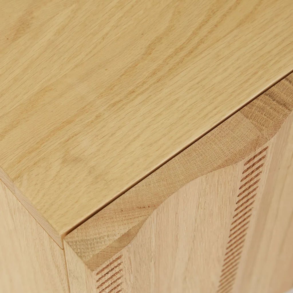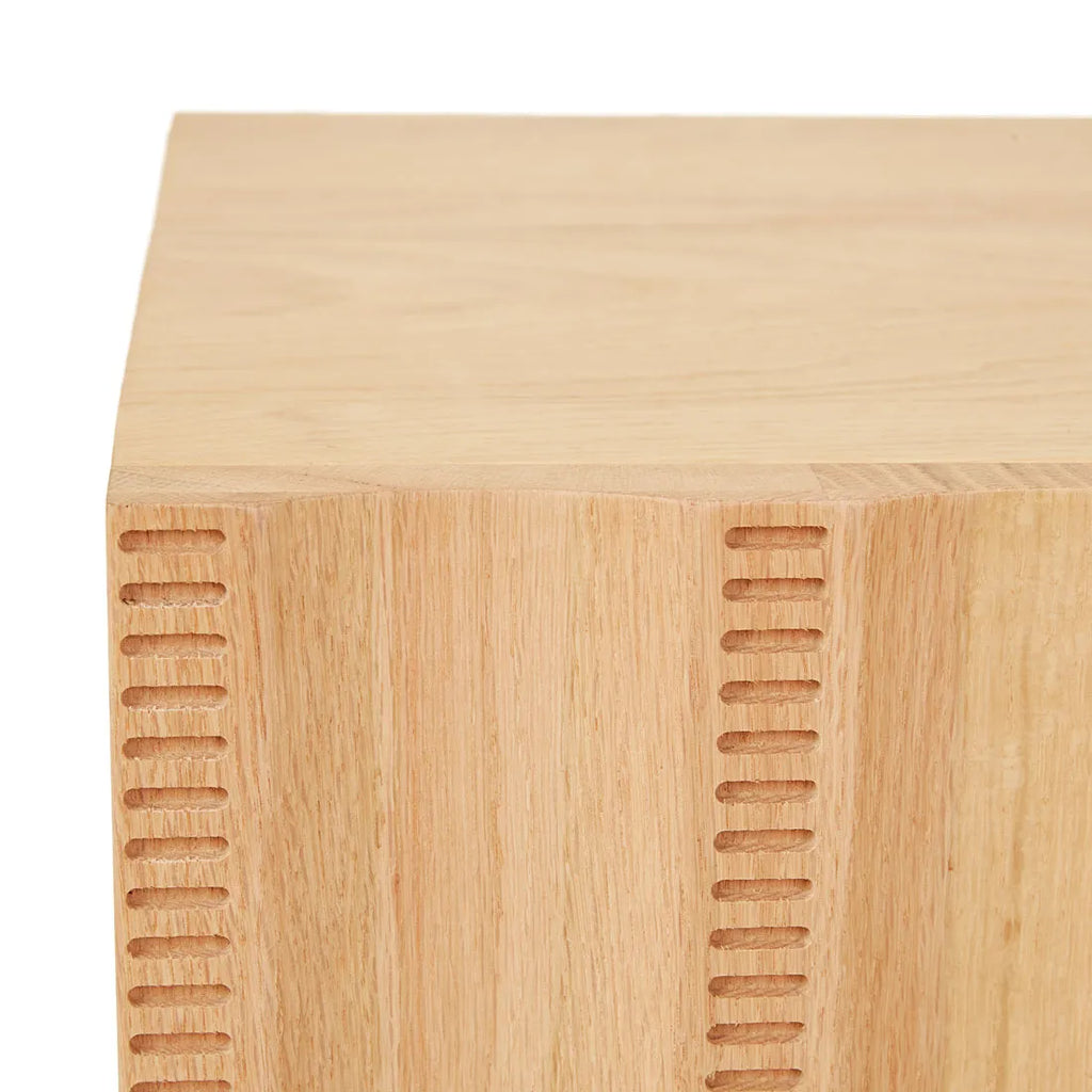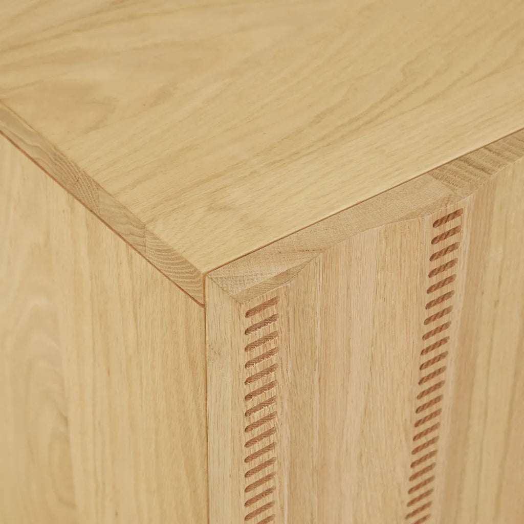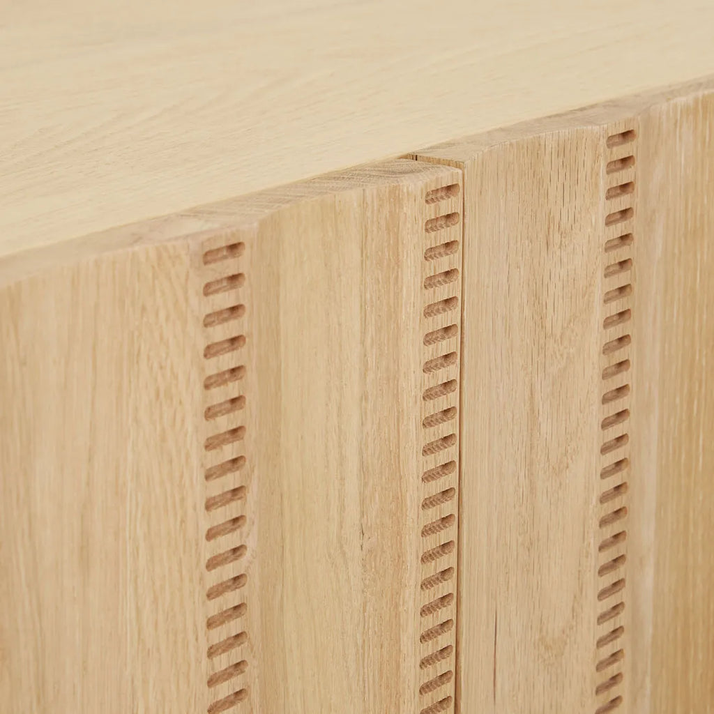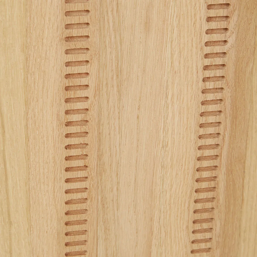 The Ember Entertainment Unit heroes natural oak adorned with intricate fluting patterns, showcasing exquisite craftsmanship. Its solid wood construction seamlessly blends alternating textures with modern proportions, adding a touch of flair to both modern and classic living spaces.