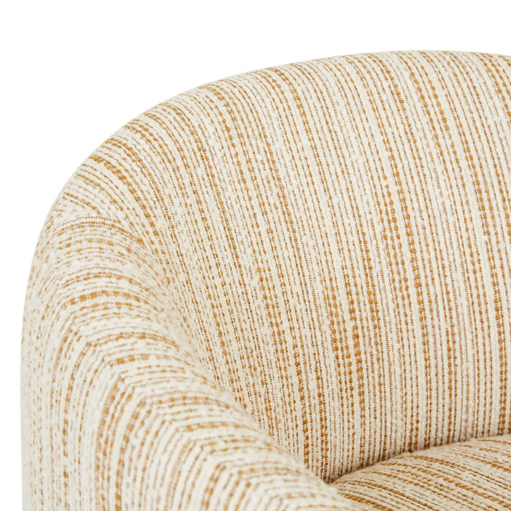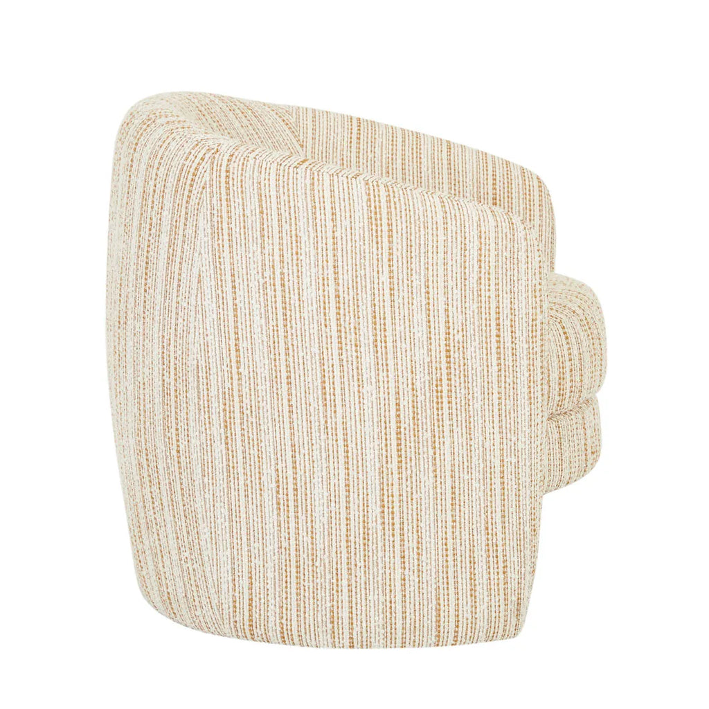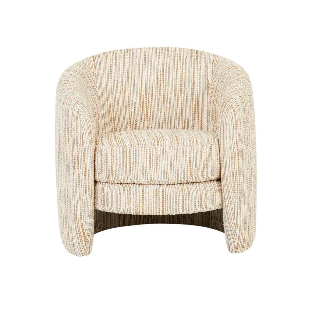 Kennedy Tenner Occasional Chair showcases a barrel-shaped design on a modern base, fully upholstered for maximum comfort. This chair merges classic elegance with contemporary flair, making it a standout piece in any indoor setting. Its patterned weave fabric enriches the decor with a subtle, sophisticated touch. Ideal for creating a cozy reading nook or enhancing a living room ensemble, this chair combines style with functionality.