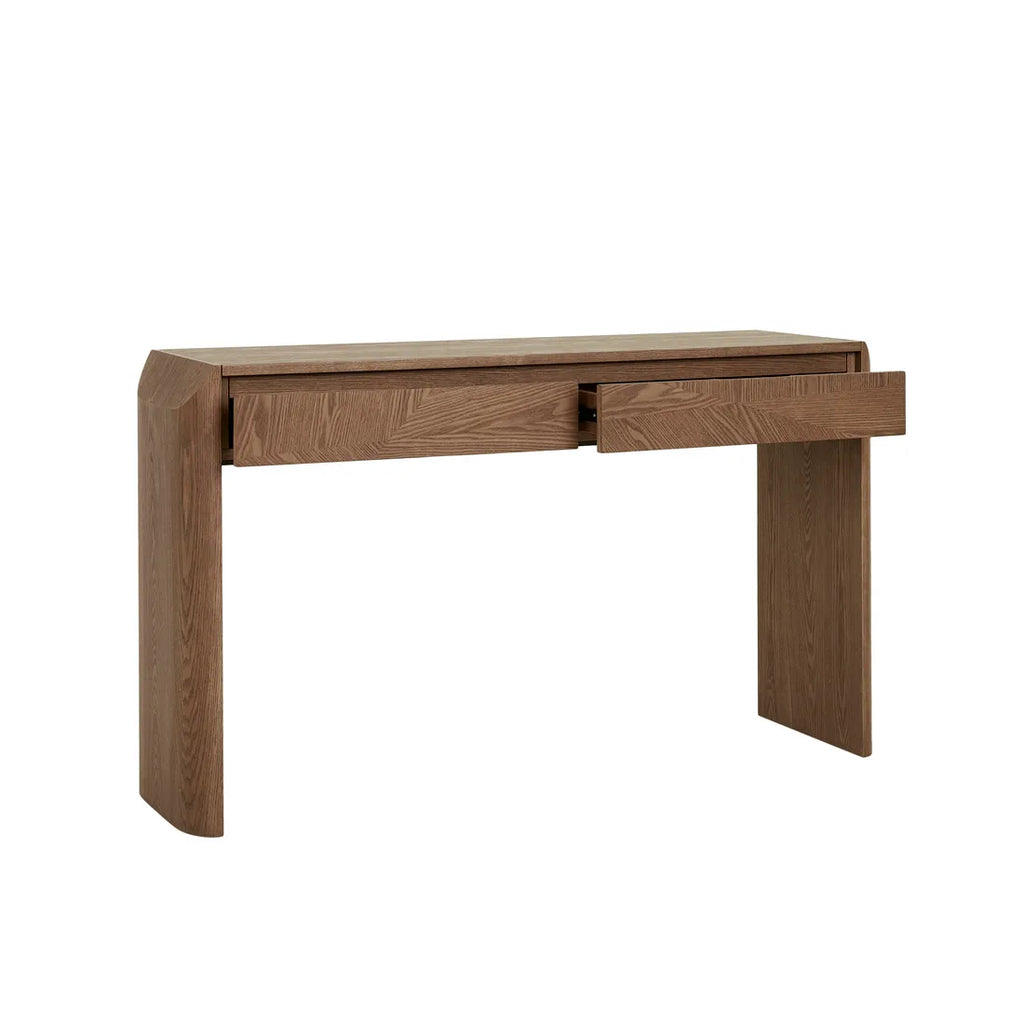 Contemporary sophistication flows through the Luna Console's graceful design. Rounded half ellipse legs blend seamlessly with geometric forms, while chamfered top details showcase refined craftsmanship. Subtle hued ash veneer creates luminous appeal across this compact masterpiece, complete with shadow line handles adorning two practical drawers. Perfect proportions suit modern spaces requiring elegant storage solutions without compromising valuable floor area