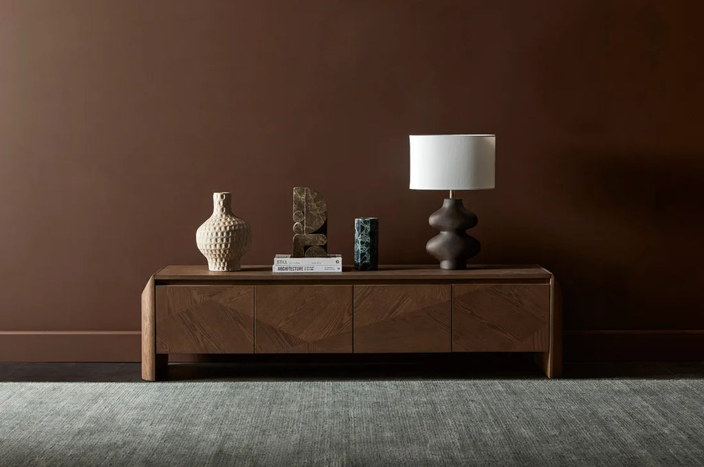 Contemporary curves contrast with modern form define the Luna Buffet's soft silhouette. Demi ellipse legs emerge gracefully beneath a lifted case creating visual lightness without functional compromise. Shadow line handles and painted ash veneer finish complete this sophisticated piece, merging seamless functionality with striking sculptural forms.