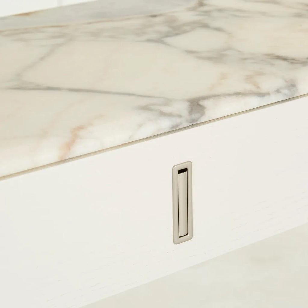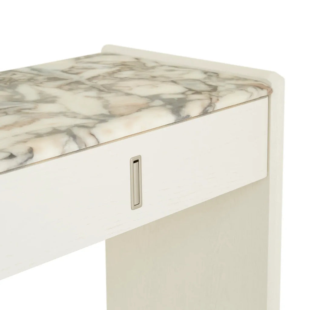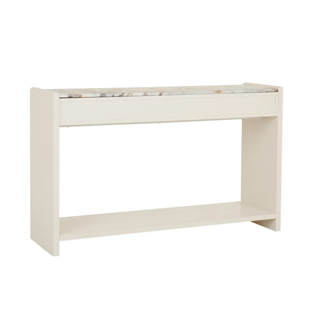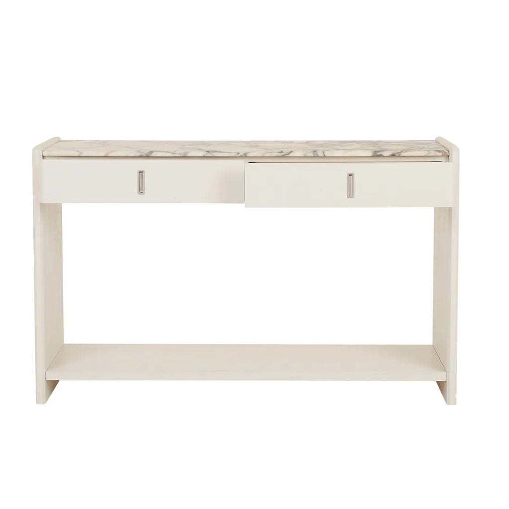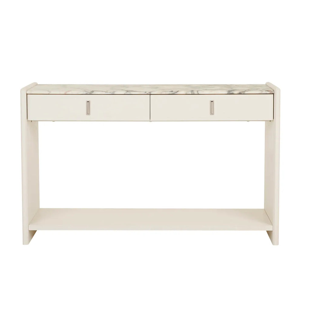 Sleek modernism finds expression through Pearce Marble Console's refined aesthetic. Matt ocean marble crowns painted veneer, creating striking visual impact through chamfered edges and rounded detailing. Hidden pull handles maintain minimalist lines while granting access to functional storage spaces beneath. Contemporary spaces benefit from thoughtful proportioning, where bone toned surfaces merge sophistication with practicality via open shelving.