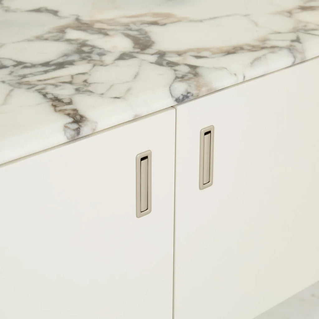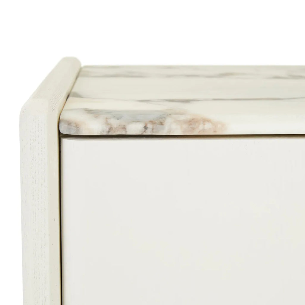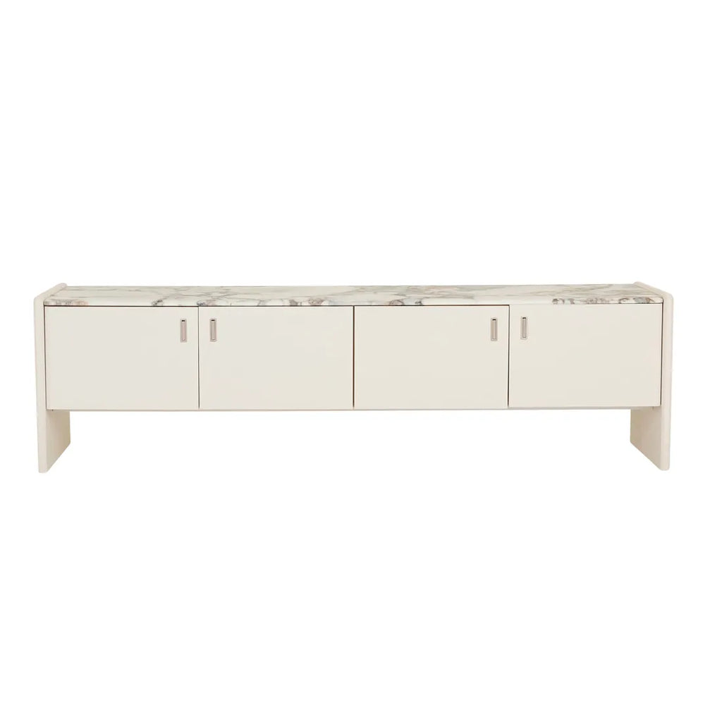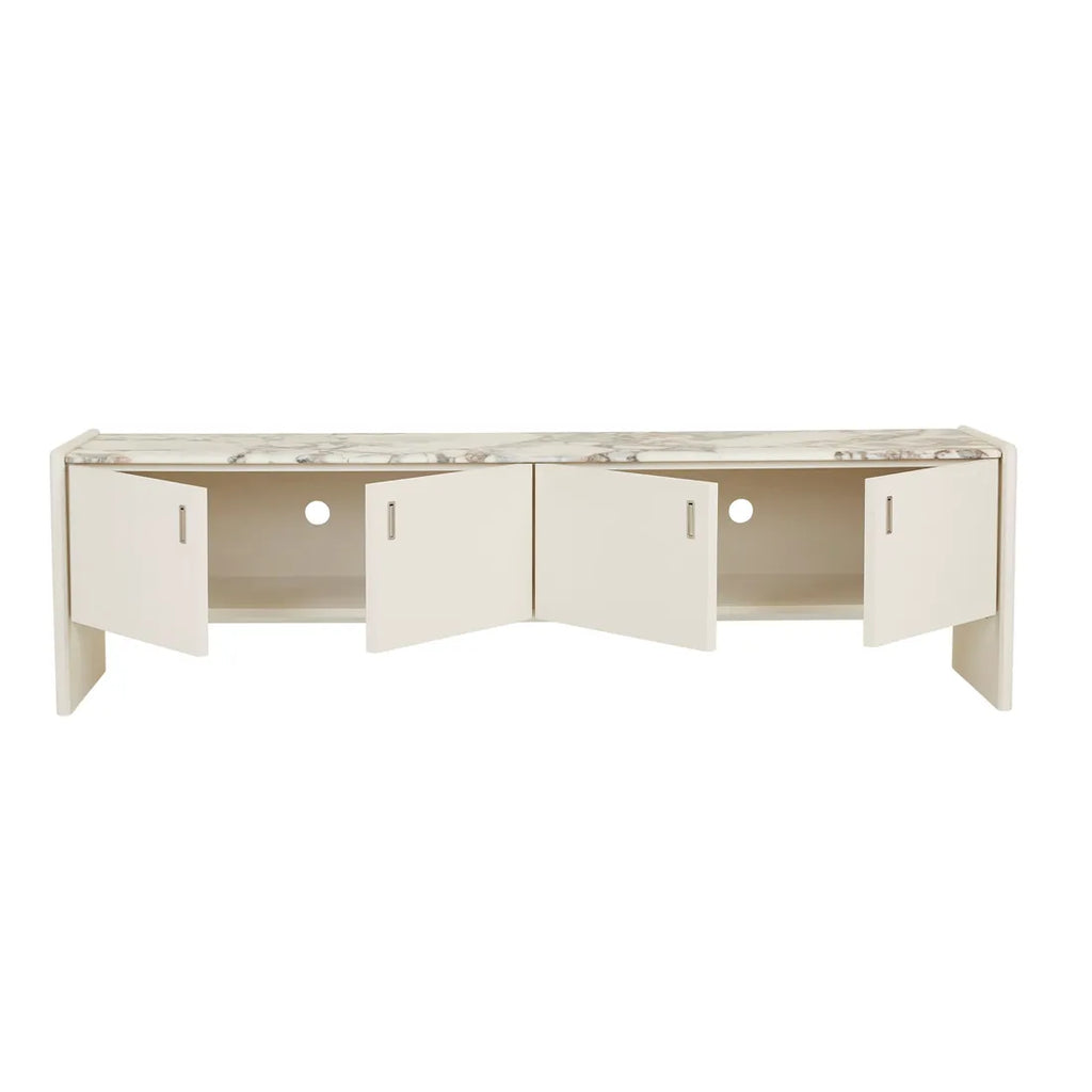 Refined modernism defines the Pearce Marble Entertainment Unit with sleek matt ocean marble and painted ash veneer in a bright Bone hue. Defining chamfered edges and hidden pull handles maintain minimalist appeal while offering ample concealed storagefor the practical yet discerning home.