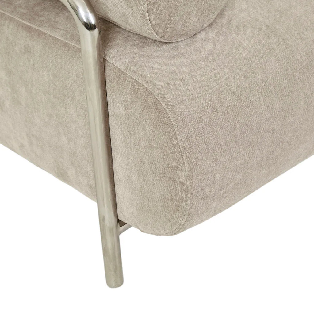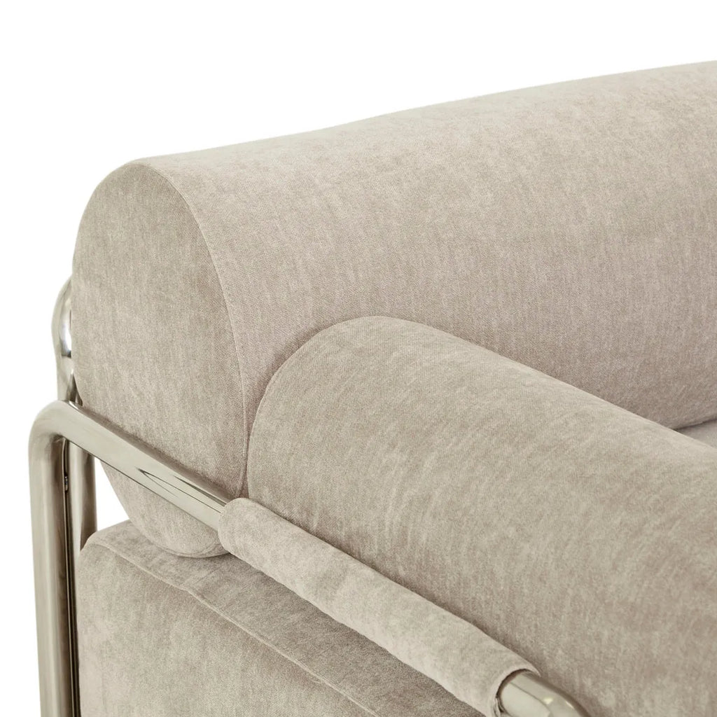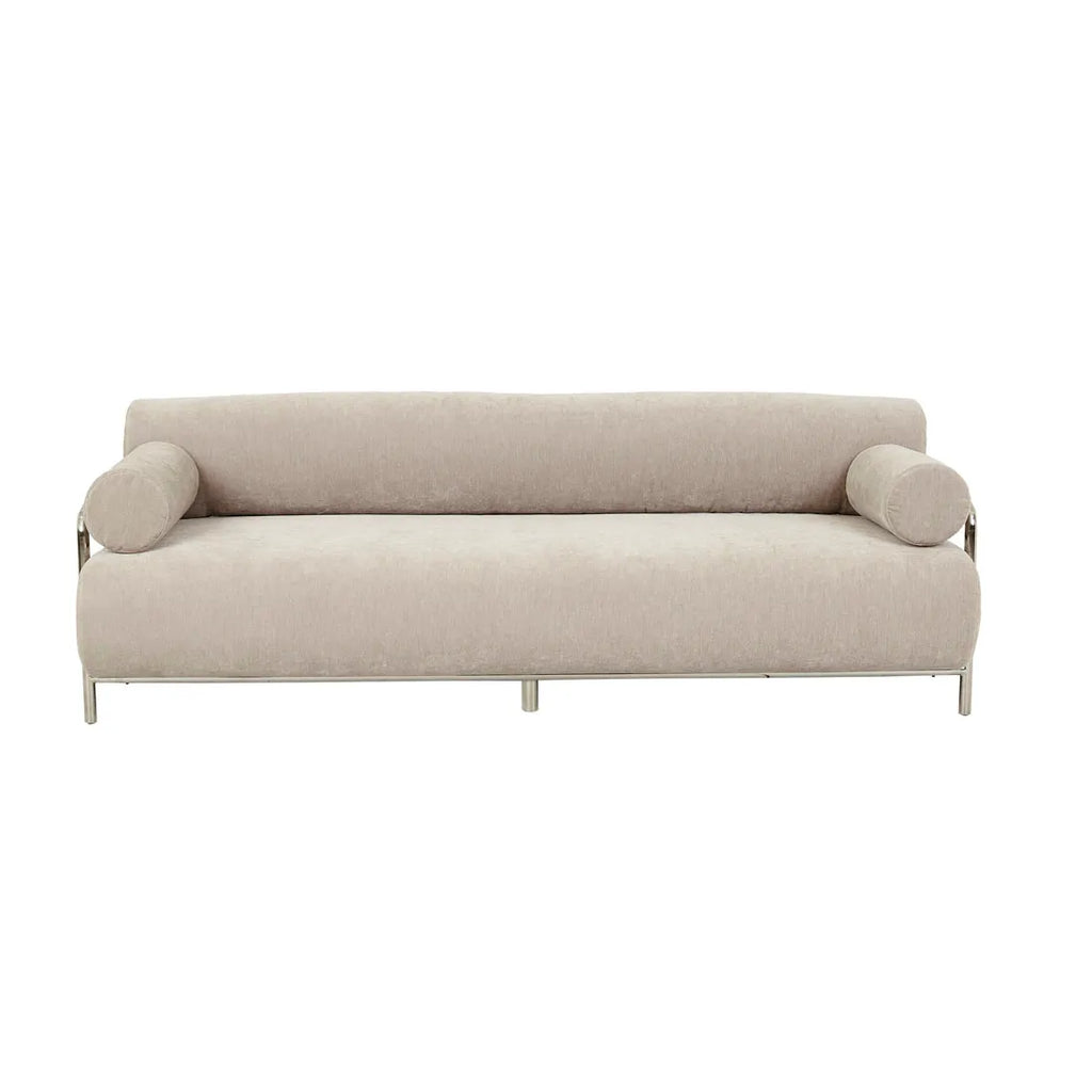 Modern artistry defines the Sidney Renzo Sofa through sculptural lines crafted from the steel frame. Parchment cushions create airy visual lightness against the metal frame. The rounded cushions deliver luxurious comfort within contemporary spaces