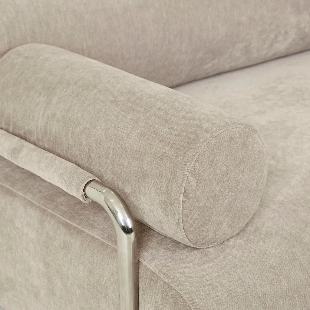 Constructed with high-density foam and dacron atop a stainless steel frame, this sofa includes two elegant arm cushions for added comfort.