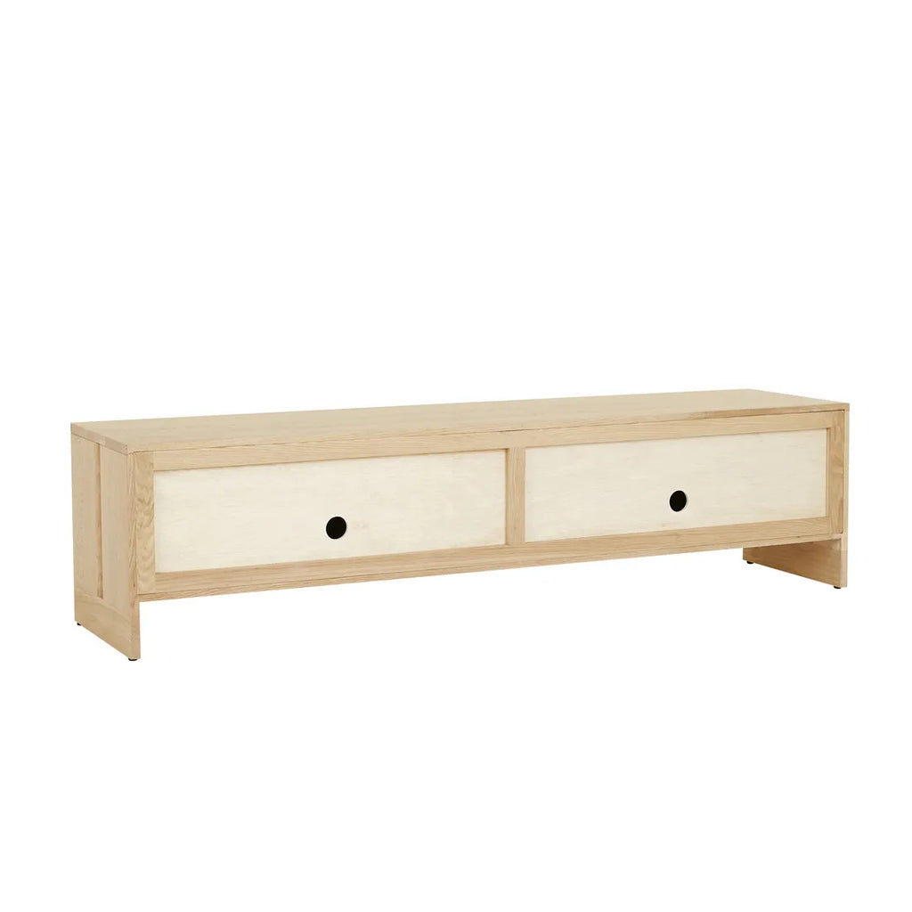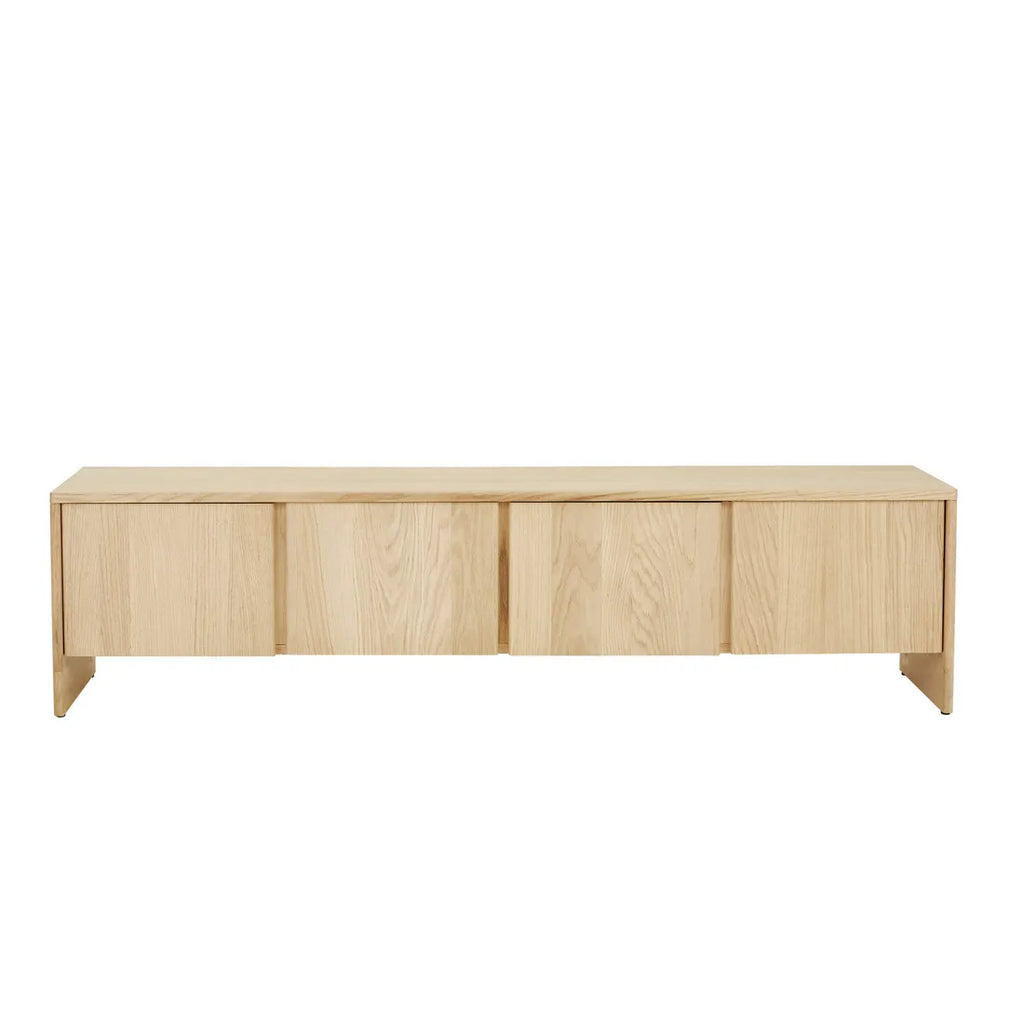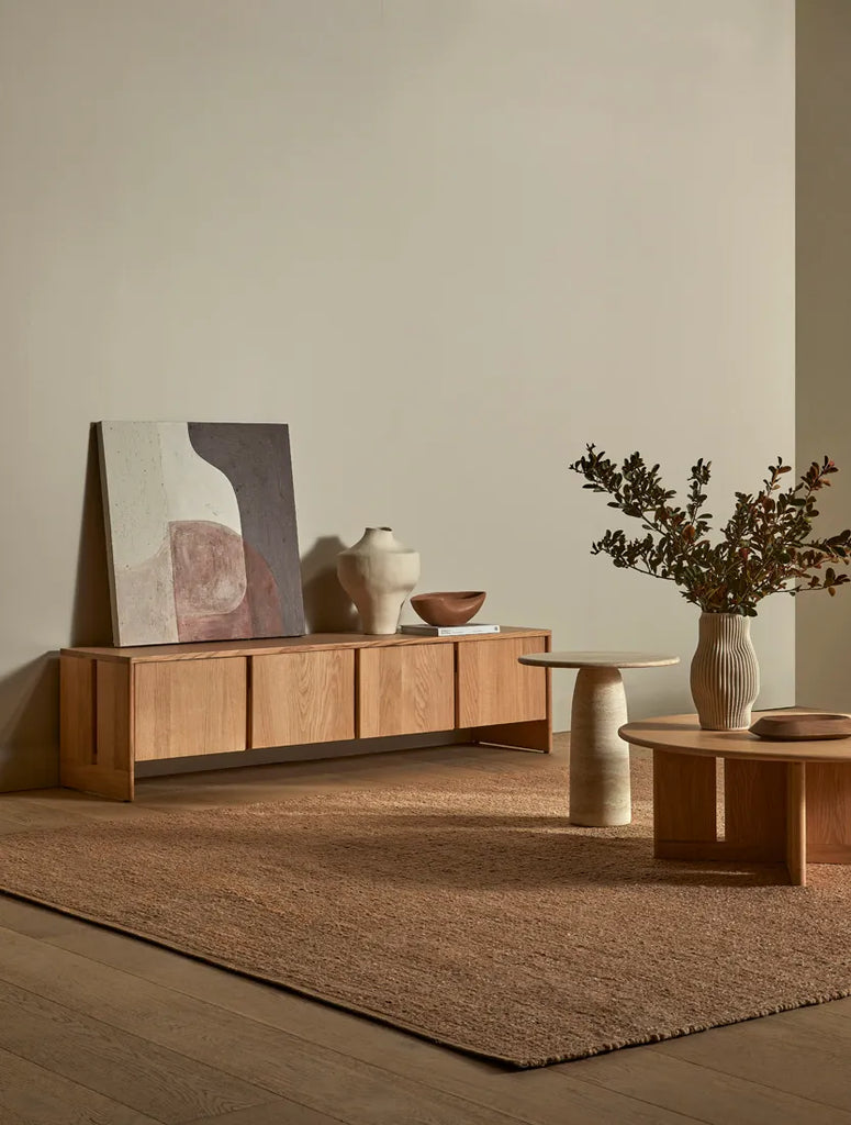 Celebrate the beauty of natural materials in the Smith Entertainment Unit, showcasing refined oak craftsmanship through traditional mortise and tenon joinery. Subtle rounded edges soften minimalist lines while hidden finger pulls maintain pure design aesthetics across surfaces. Contemporary storage flows behind seamless panels, concealing practical internal shelving beneath a clean New oak finish. Each thoughtful detail celebrates solid timber's inherent character.