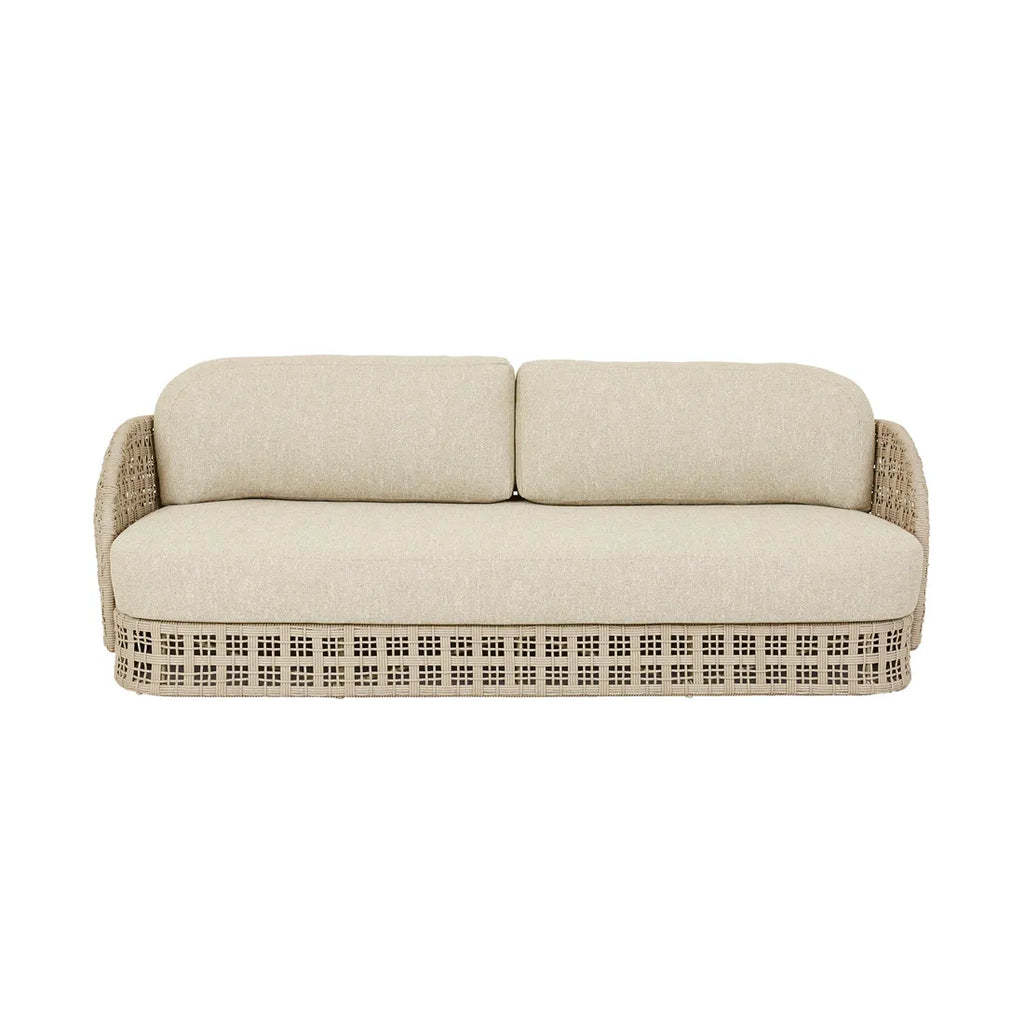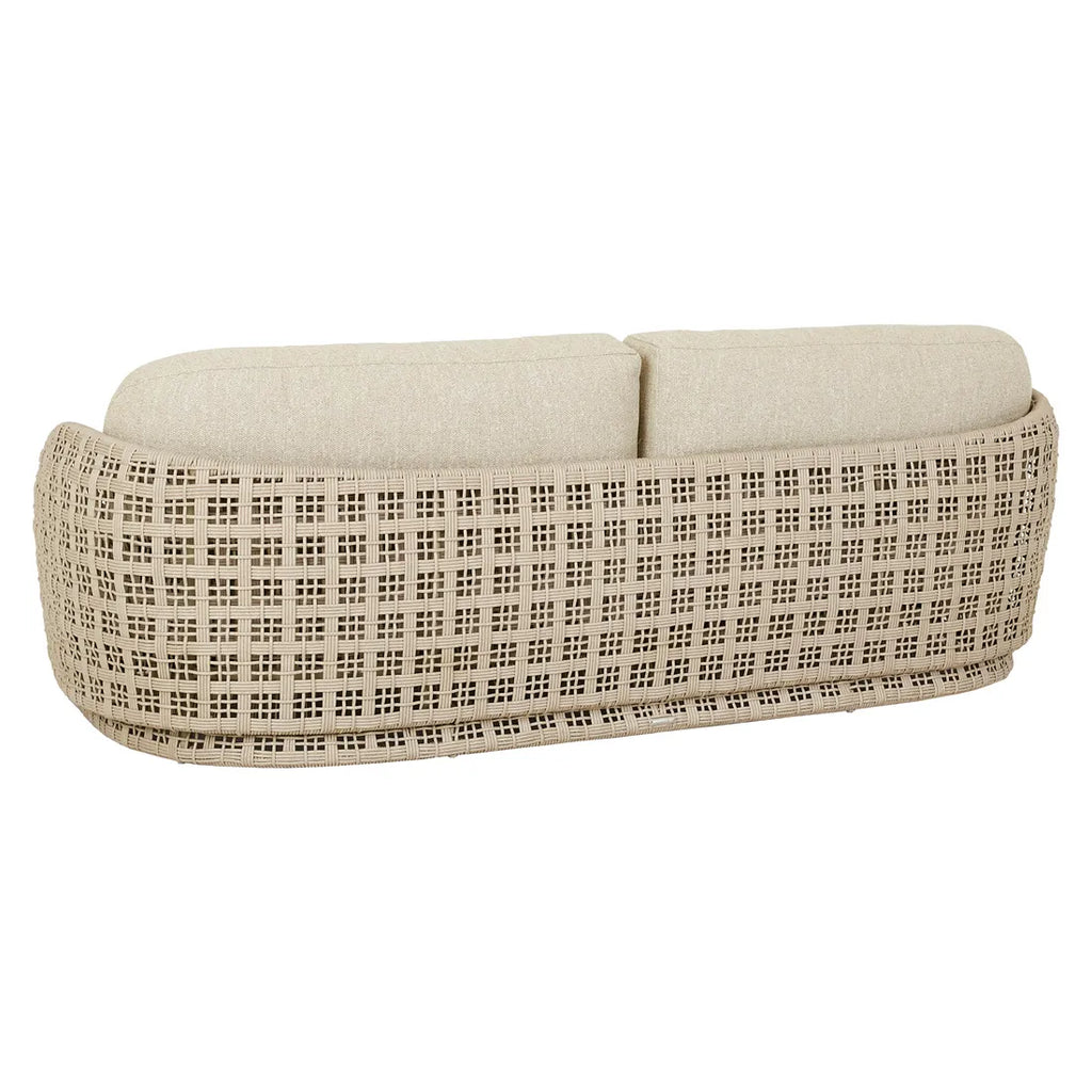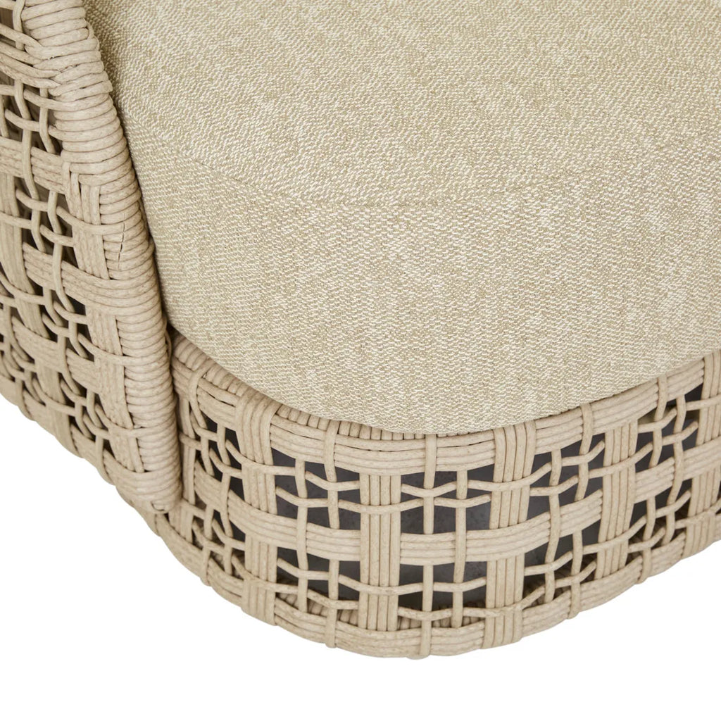 Organic curves merge seamlessly through the Cohen Sofa sculptural weave design, reflecting natural sand dune formations. Outdoor ready resin construction delivers lasting durability while quick-drying upholstery maintains year round comfort. Shell toned mushroom fabric radiates modern sophistication across gracefully curved arms, creating striking visual appeal.