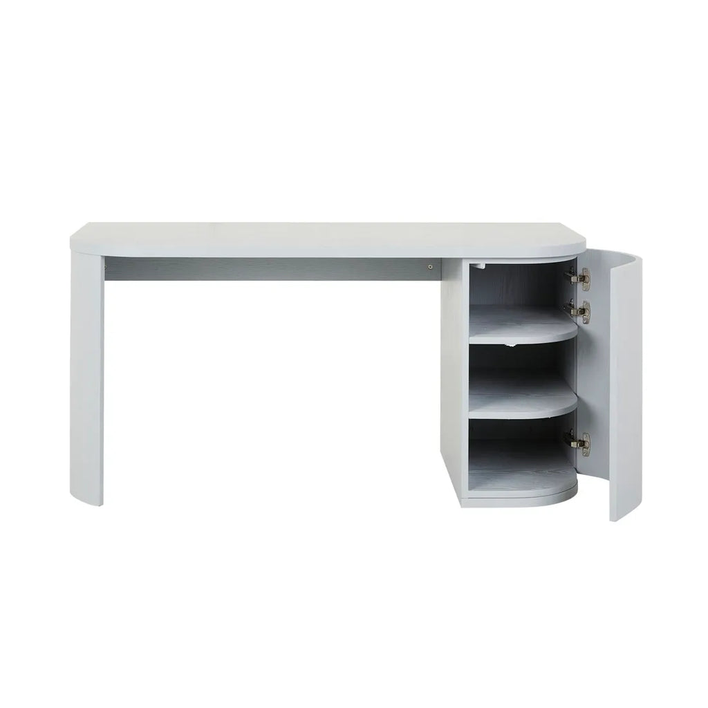 Constructed with ash veneer and a water-based sealer, this desk features one door and three shelves equipped with hettich push to open hardware for added convenience.