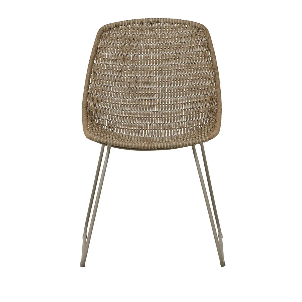 Contemporary outdoor refinement defines the Normandy Sleigh Dining Chair. Powder-coated steel frames supports a mixed weave of resin and rope, creating a unique construction, and visual focal point. All while delivering premium durability matched with sophisticated style. Modern sleigh legs create graceful curves beneath pebble-toned seating, bringing relaxed retreat ambiance into outdoor dining spaces