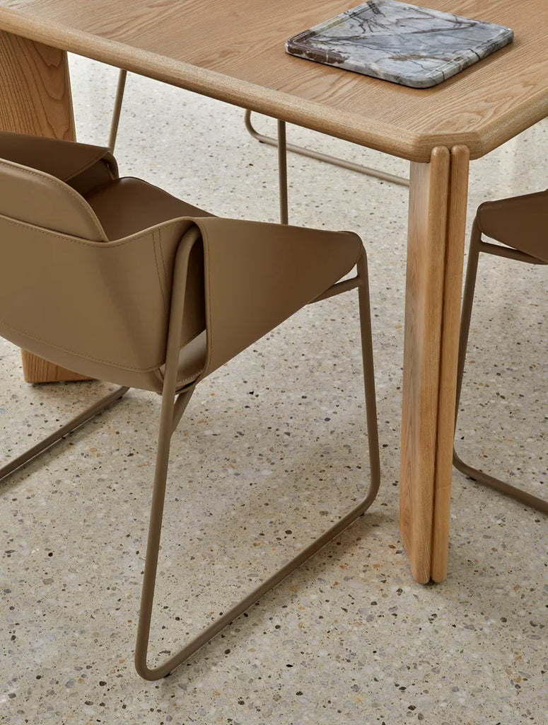 This is a minimalist dining table made from ash veneer, featuring softly rounded edges and seamlessly integrated legs for a refined, modern look with a natural wood finish.