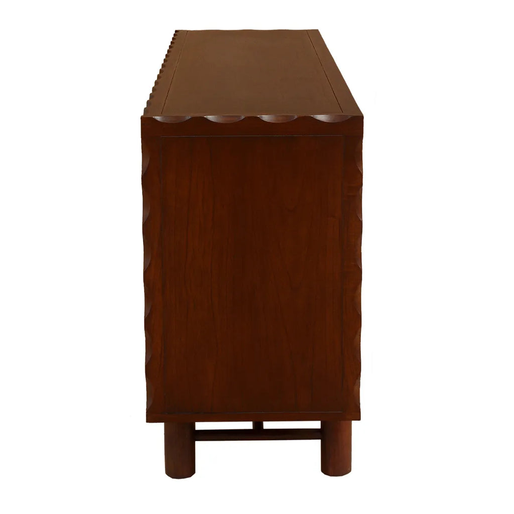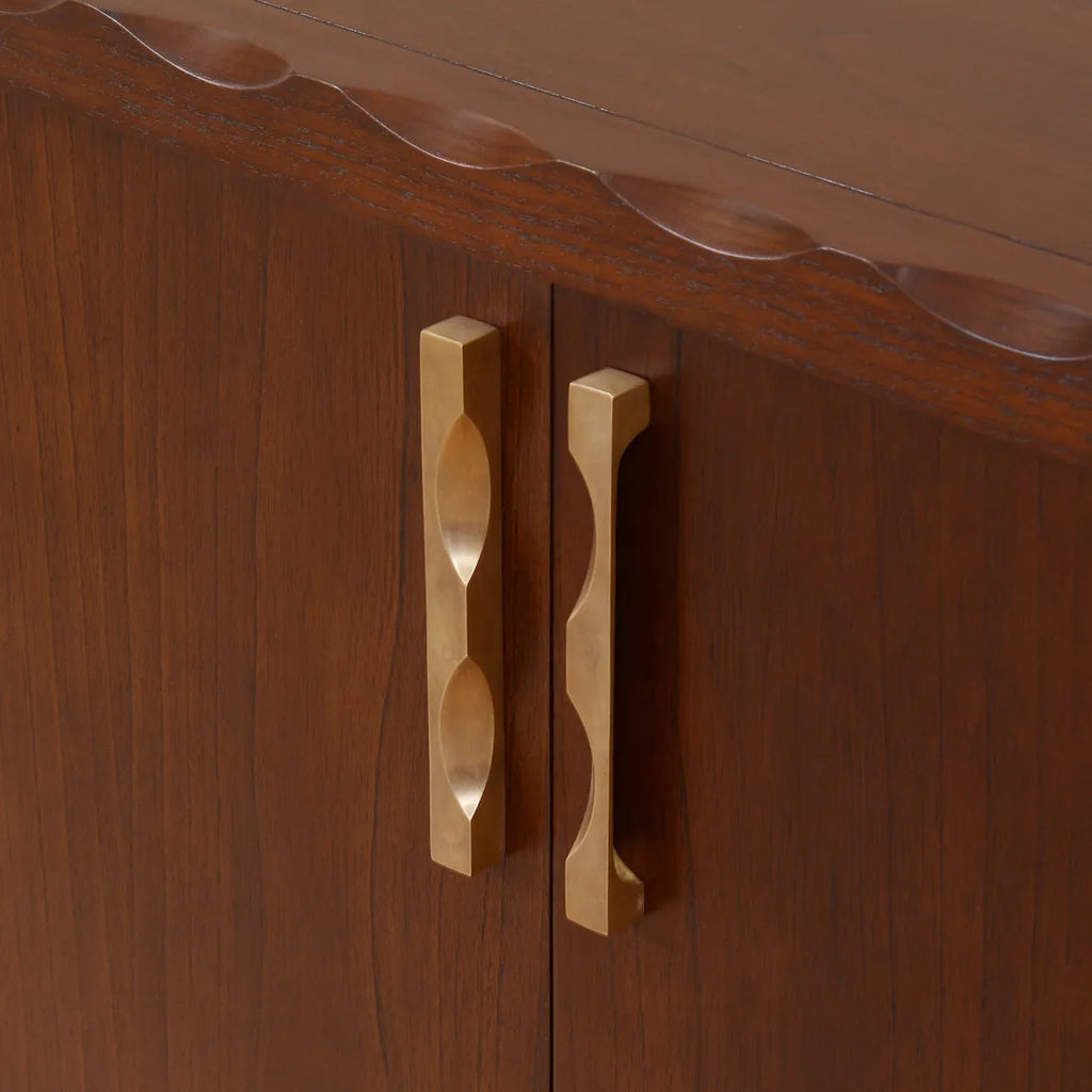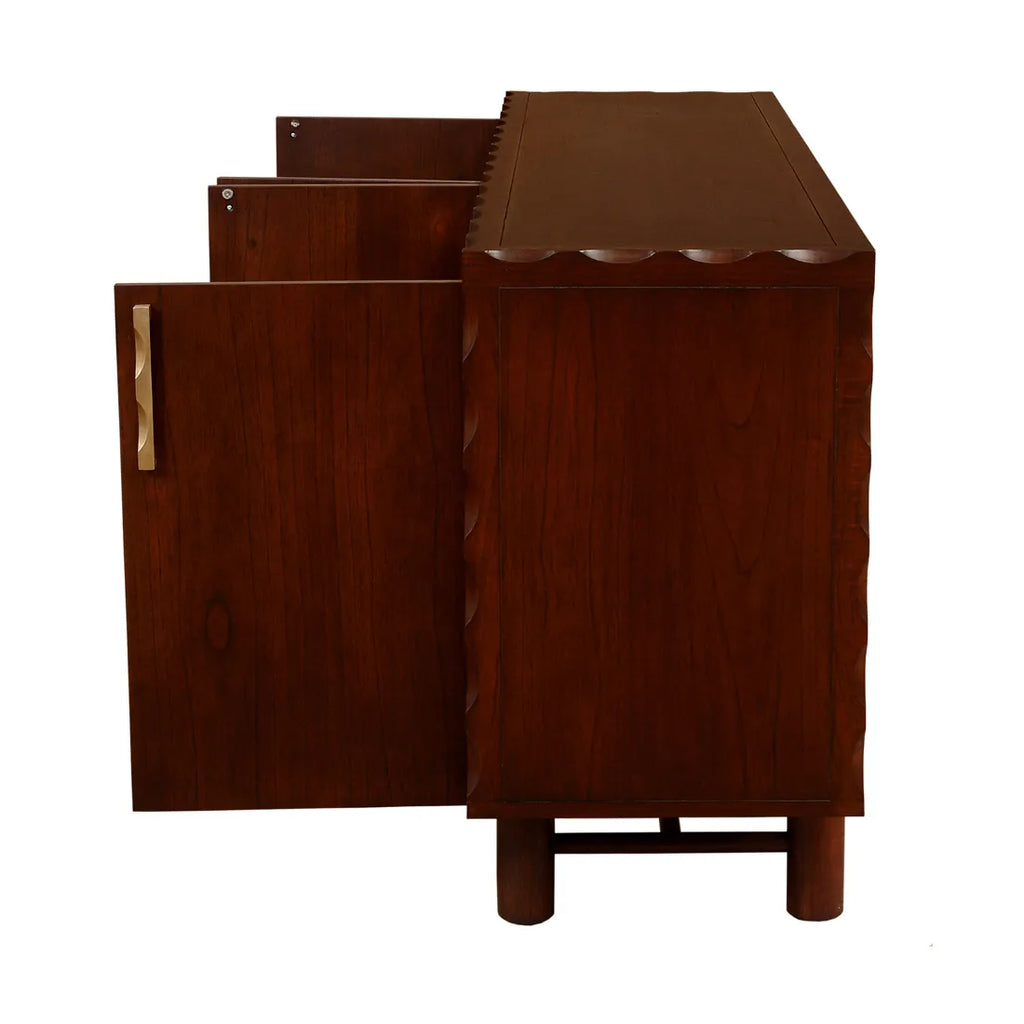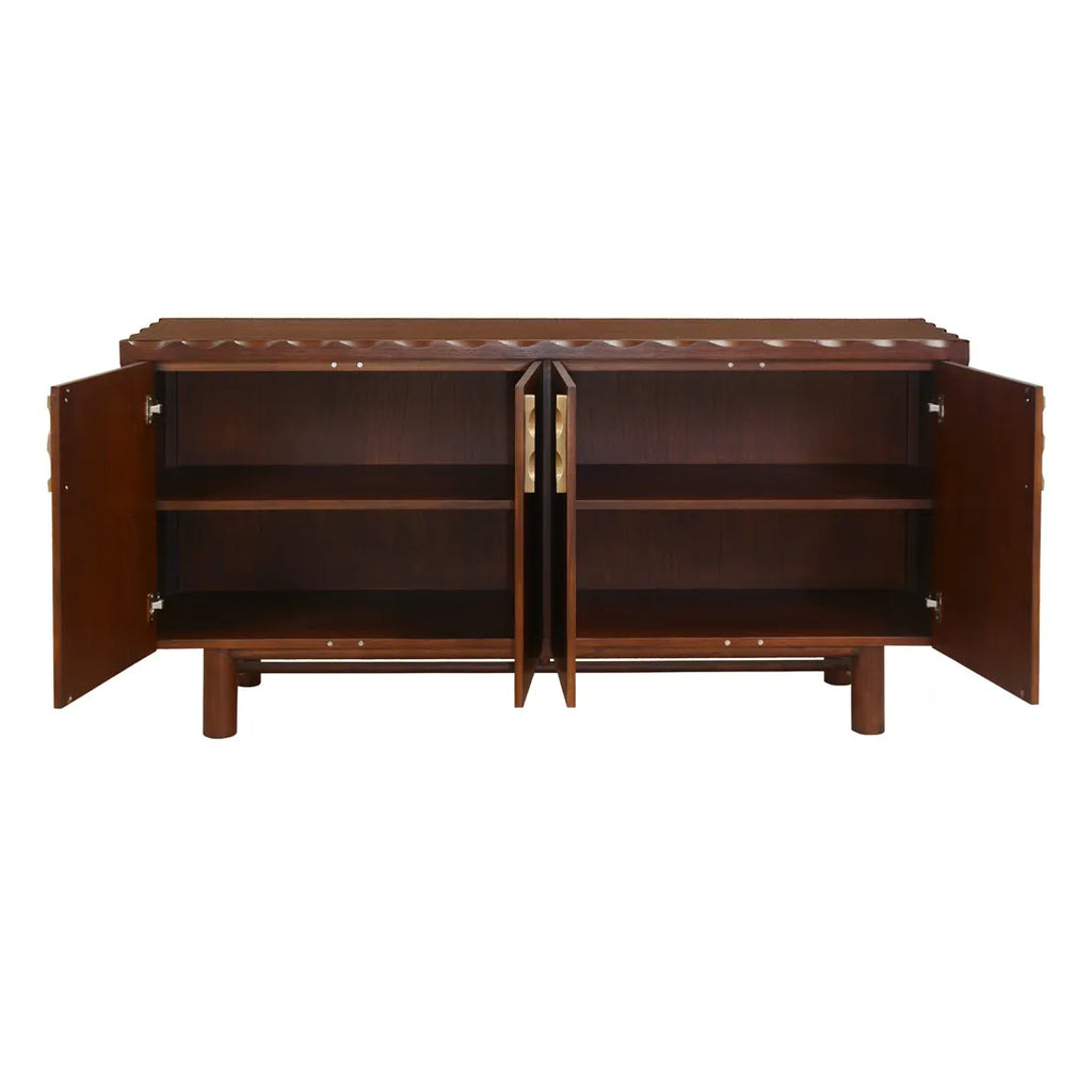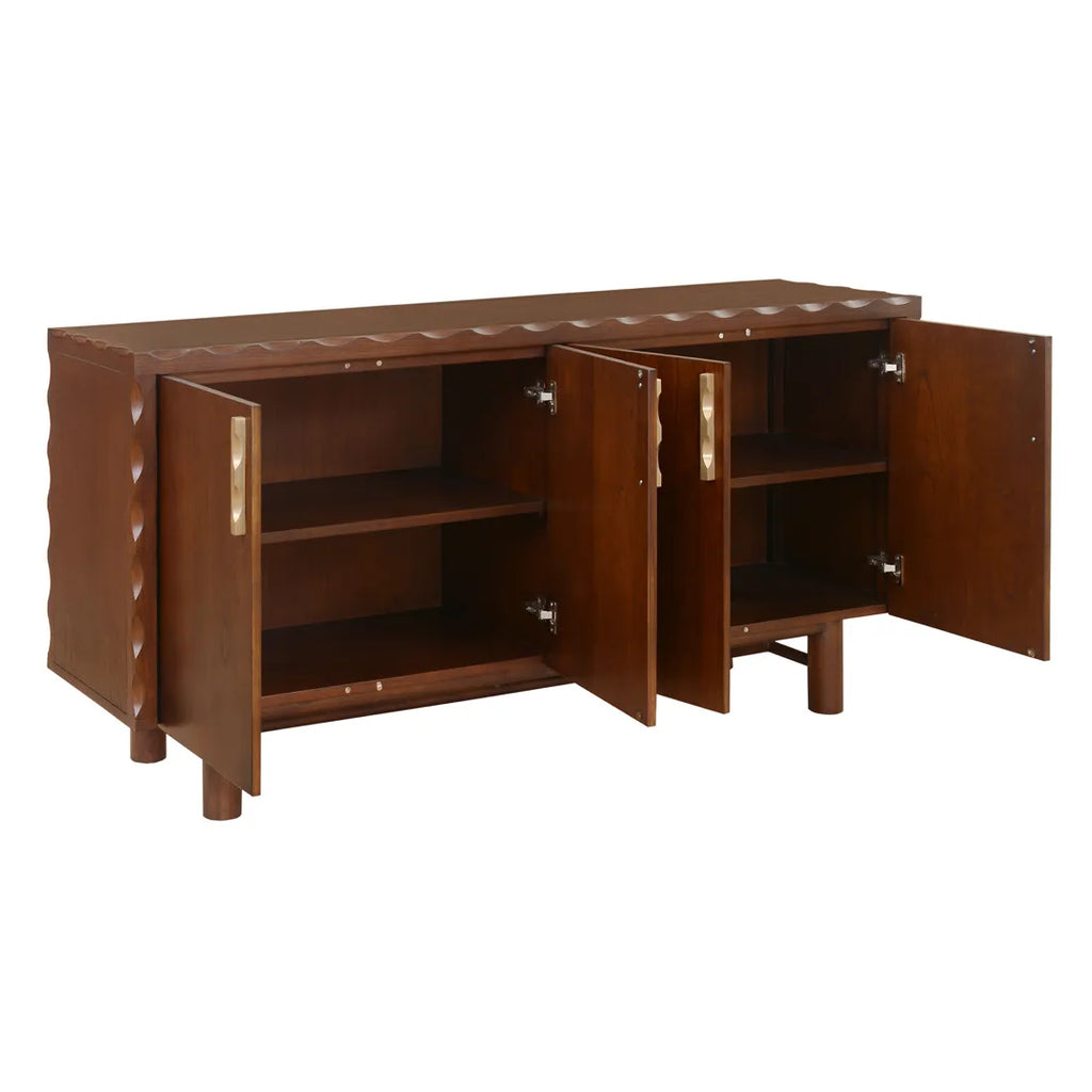 Natural ocean waves inspire the Trove Ondine Buffet's undulating carved surfaces, combining organic movement and modern shape. Mindi veneer creates rich, tactile appeal across natural toned surfaces and golden door pulls. Blending eclectic sensibilities with form and function, this distinctive buffet enriches interiors through thoughtful design details.